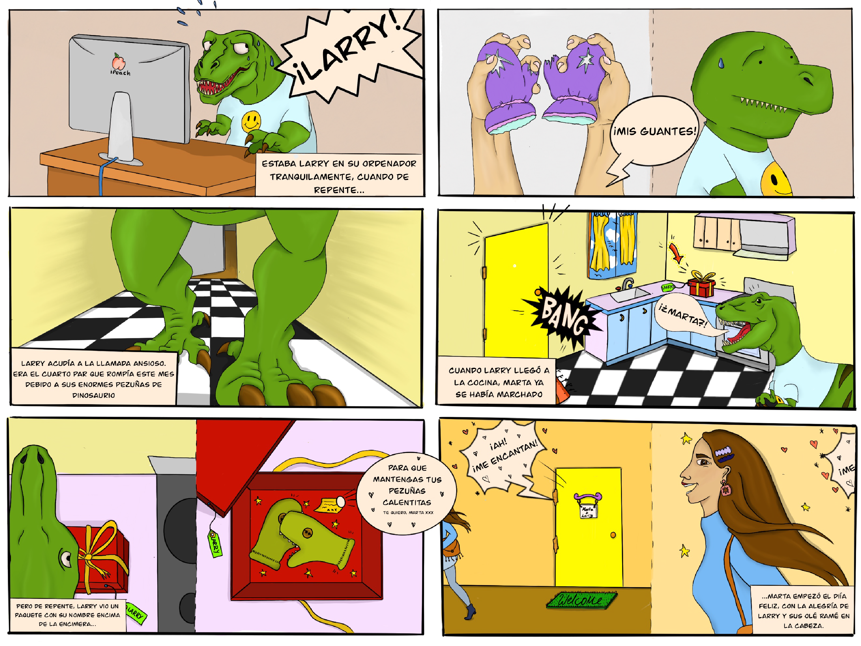 Finalmente, Celino viajaba a Tierra de Dinos a visitar a nuestra amiga Marta y a Larry, su compañero de piso. Larry es un tiranosaurio Rex bastante curioso y una de sus aventuras la plasmó nuestra querida amiga Marta en formato cómic.